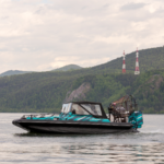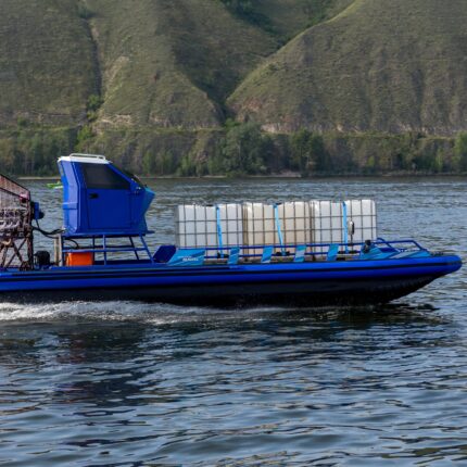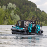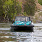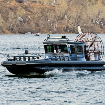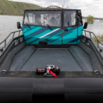 Съемный ходовой тент с панорамными окнами надежно защищает от непогоды. Модель может быть оборудована еще двумя тентами: для защиты груза на передней платформе и стояночным тентом-палаткой, который полностью накрывает носовую часть лодки.